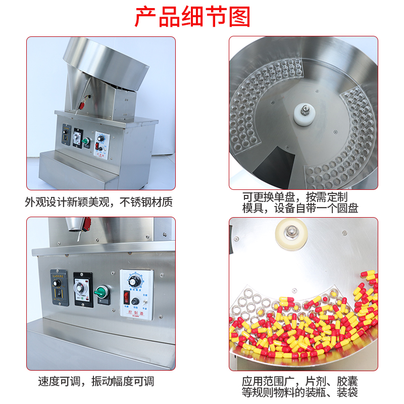 適用范圍:用于各種型號膠囊、藥片、軟膠囊、蜜丸和其它有規則形狀物品的計數裝瓶、裝袋。
