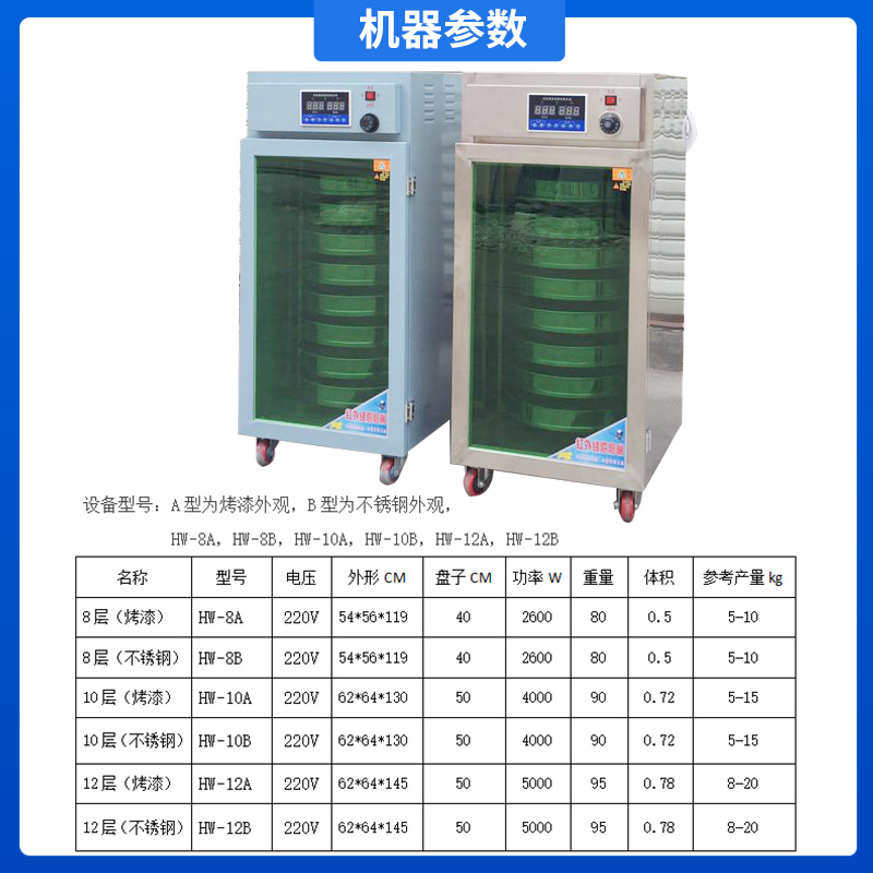 采用智能控制面板,紅外線加熱,箱風溫度自由控制,帶恒溫功能,可自由設定烘焙時間,定時報警,手工關機,獨立設計限溫器,和電腦版的溫控系統(tǒng)雙重保護,機器使用和物料烘干更安全,可旋轉烘干機,時間自由控制,溫度自由控制,雙重保護,上下受熱均勻,中藥材、香料、紅棗、植物種子等的烘干五谷雜糧比較實的,設備有大小,根據(jù)自己的需要選擇需要的機型。